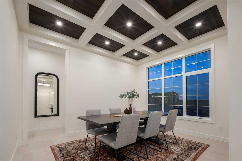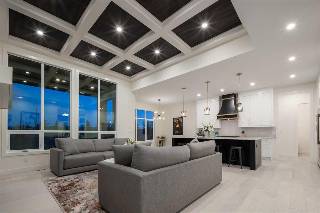 Nestled in the prestigious Silverhorn Estates, this stunning 2024-built residence offers nearly 4,500 square feet of impeccably designed living space on a sprawling 1.73-acre lot. The open-concept main level is ideal for both everyday living and elegant entertaining, featuring rich coffered ceilings, a striking floor-to-ceiling tiled fireplace, and expansive South-facing windows that flood the home with natural light. The gourmet kitchen is a showstopper with floor-to-ceiling cabinetry, marbled quartz countertops, a stainless-steel gas range, massive double-door fridge/freezer, and a charming breakfast nook. Three main-level bedrooms include a luxurious primary suite with a spa-inspired ensuite and custom walk-in closet. Additional highlights include a formal dining space, main floor laundry, and bleached oak engineered hardwood throughout. A light-filled loft above the heated triple garage offers versatile space for an office, studio, or playroom. The fully finished lower level is an entertainer's dream with a large rec area, theatre room, gym, and two more spacious bedrooms. Ideally located just 30 minutes from both downtown Calgary and the airport, and only 15 minutes to Crowfoot Centre and an abundance of retail shopping, this home offers the perfect balance of serene estate living with convenient city access. A true gem in the heart of Silverhorn.